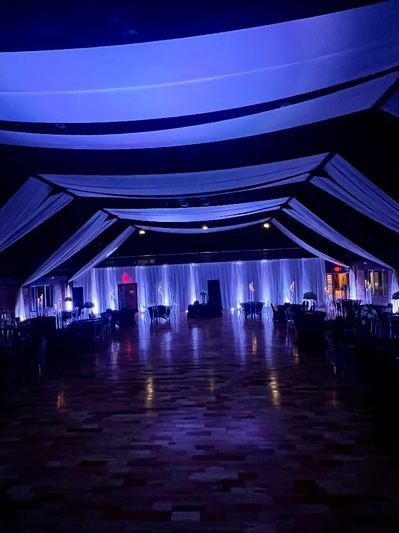 The space features a built-in stage and an elegant mezzanine that overlooks the main floor—perfect for VIP seating, cocktail lounges, photo opportunities, or additional guest seating. The dramatic scale and clean design allow your décor, theme, and vision to take center stage.